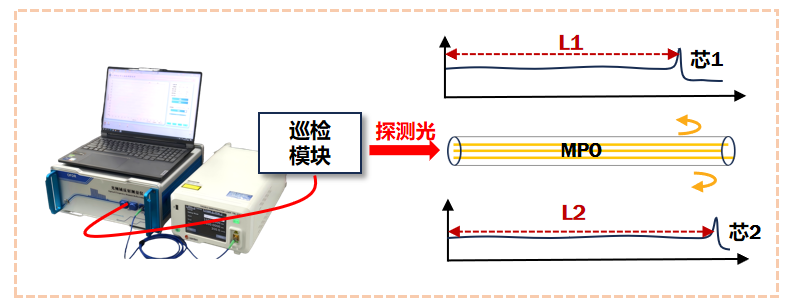 MPO光纤具有芯数多,体积小的优点,并能支持400\800G等高速数据传输。被广泛用于数据中心等场景。在其生产过程中,需要获取多芯之间、批次之间的时延一致性,从而评价MPO跳线的制备工艺是否符合设计要求。 本案例中,使用OFDR-H光纤分布式损耗测量仪,精确计算了MPO跳线多芯的传输延迟,获取多芯之间、批次之间的时延一致性,从而评价MPO跳线的制备工艺是否符合设计要求。
