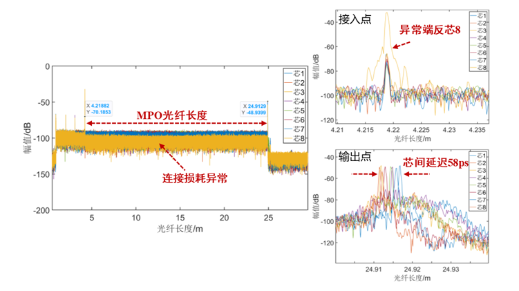 右图一,识别了第8根纤芯接入点处,存在异常的反射面;