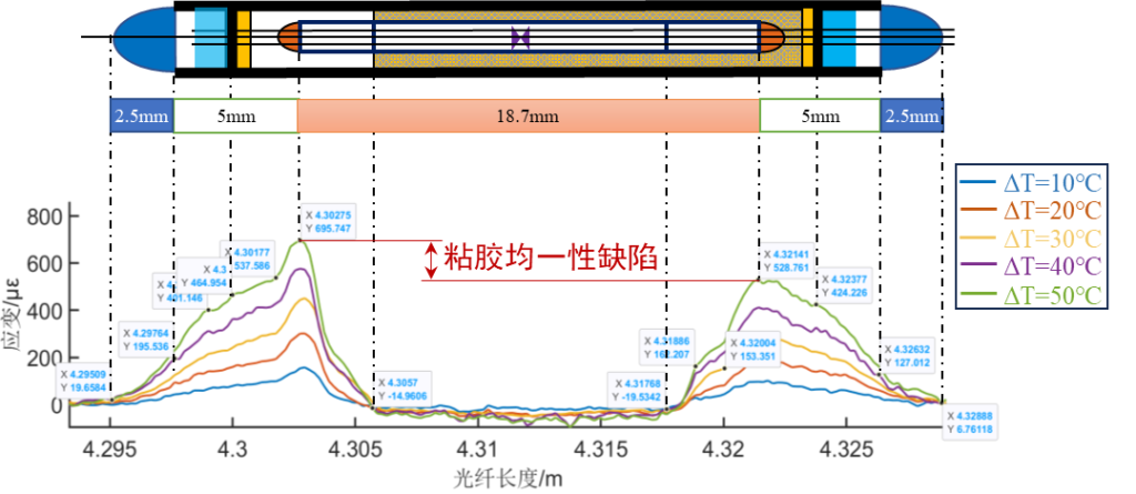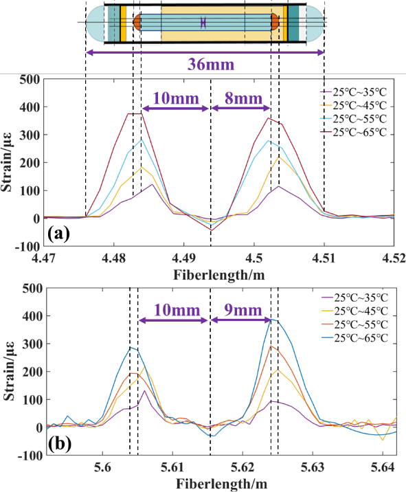 本案例中,使用OFDS-H光纤分布式传感解调仪,借助温箱改变温度,对合格耦合器(a)和不合格1×3耦合器(b)进行激励。可定量观察到两者应变的差异,从而定位耦合器内部缺陷发生的位置。