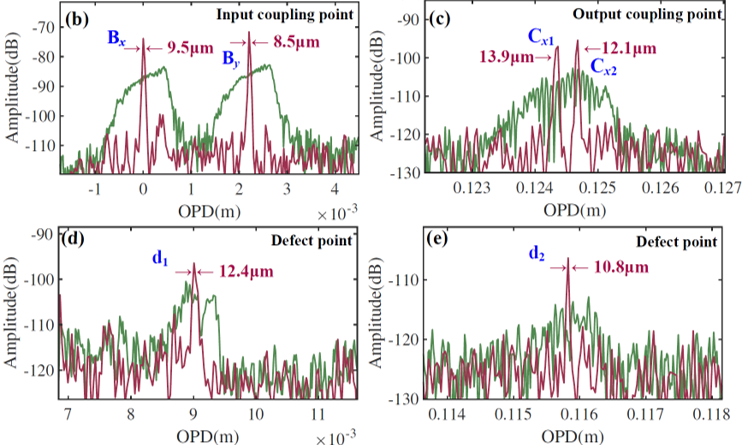 本案例中,使用OFDR-H光纤分布式损耗测量仪,以10μm空间分辨率,成功分辨了光纤/芯片耦合点、Y波导耦合点的散射峰,获取了高精度的芯片散射特性。各反射位置信息如下图所示:
